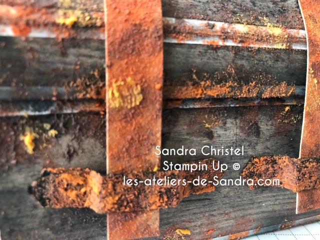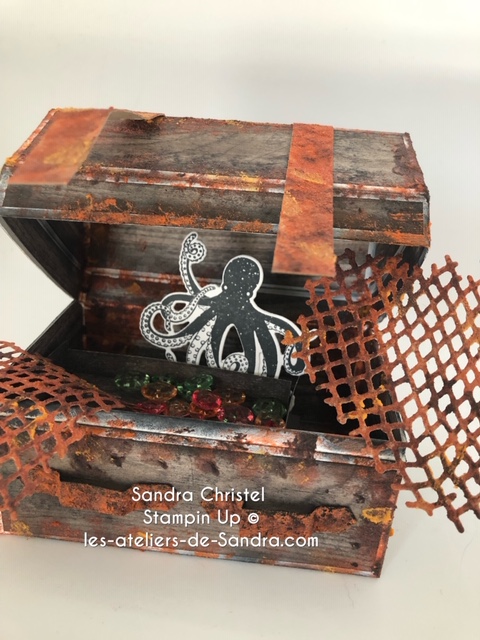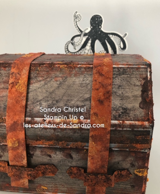 J’ai imaginé un coffre qui a passé beaucoup de temps dans l’eau et qui a donc, beaucoup rouillé !! et bien sur, il renferme un trésor :-). J’ai utilisé le l’ensemble Océan de textures que vous retrouverez à la page 155 du catalogue annuel, les papiers de la série design Textures bois page 191.