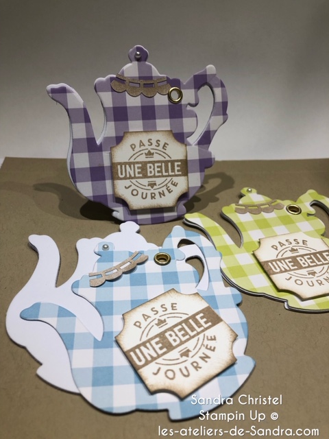 J’ai choisi ces framelits « l’heure du thé » que vous pouvez gagner dès 120 € d’achat dans l’un les catalogues Stampin Up et j’ai confectionné un un petit carnet avec des pages blanches à l’intérieur et le tout est relié avec un oeillet.