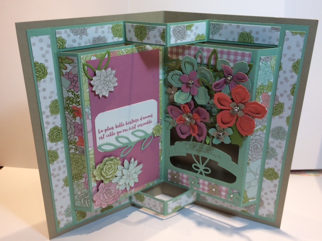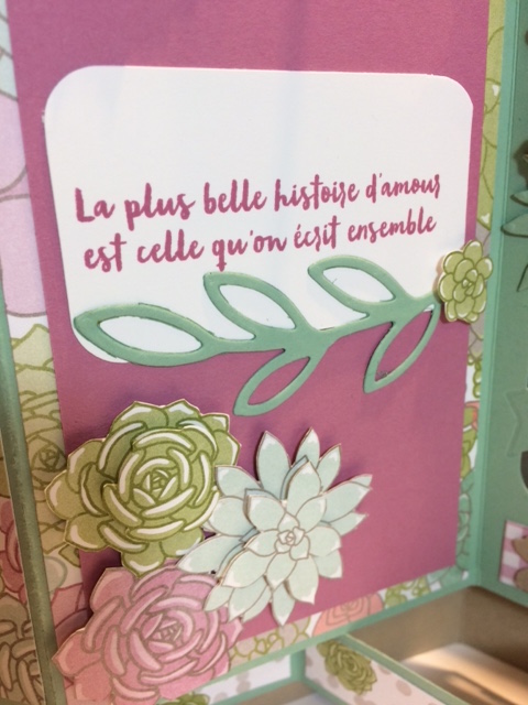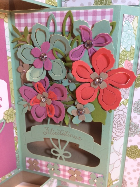 Pour réaliser cette carte, j’ai utilisé les framelits paysagiste réf : 140625 que j’ai associé aux papiers de la série design Jardin florissant réf : 142778, ainsi les poinçons thinlits Ballons saillants que vous retrouvez sur cette carte recouvert de ces magnifiques fleurs 🙂