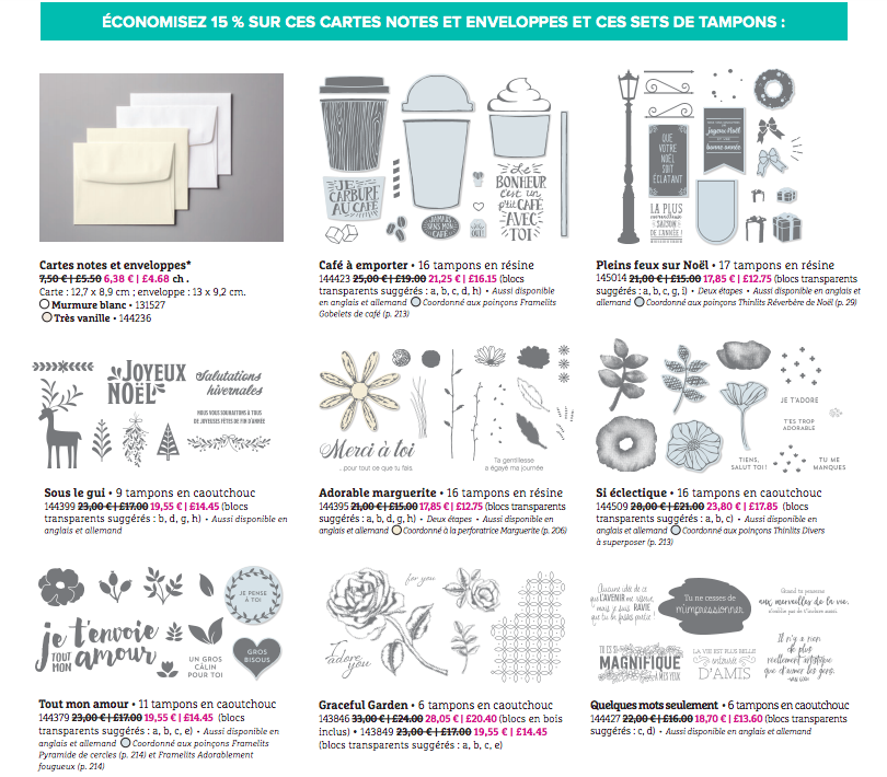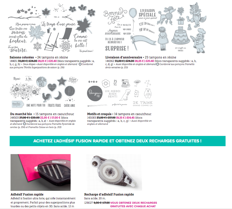 Vous pouvez acheter avec une remise exceptionnelle une sélection de set de tampons magnifiques, des « cartes notes et enveloppes » ainsi que l’adhésif fusion rapide et ses recharges