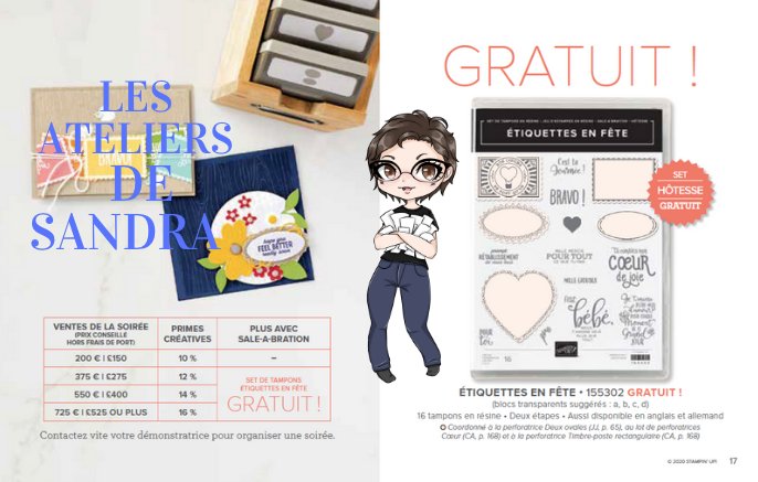 Vous vouliez commander en ligne ou participer a un atelier : avec votre commande, c’est un set de tampons Sale A Bration en plus pour 60€ d’achats ! (ou 2 sets pour 120€….). Par exemple, si vous achetez 180 €, vous pouvez choisir trois articles de niveau 1 ou un article de niveau 1 et un article de niveau 2.