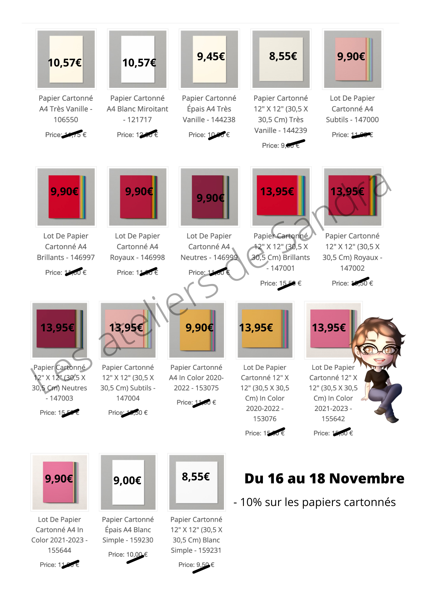 J’espère que cette offre répond à vos attente et que vous allez en profiter pour comme moi, faire le pleins de papiers cartonnés, d’encreurs, et acheter le dies qui me fait rêver 😉