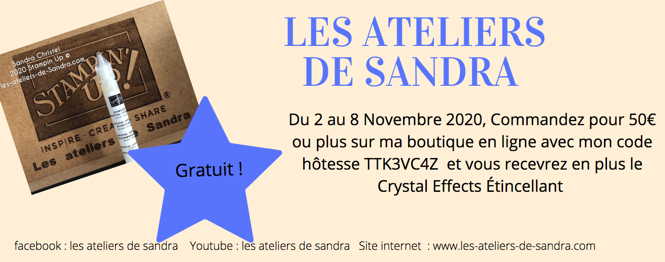La deuxième, c’est une promotion personnelle, qui n’engage que mois ! du 2 au 8 novembre 2020, pour toute commande de 50€ ou plus vous gagnerez en plus du cadeau mensuel en utilisant mon code hôtesse TTK3VC4Z , du Crystal Effects Étincellant !!!
