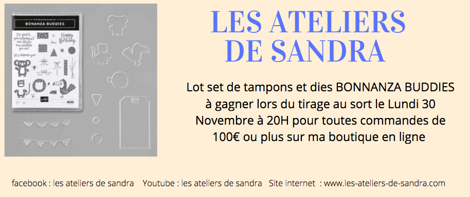 La Troisième, c’est encore une promotion qui n’engage que mois, c’est un tirage au sort le Lundi 30 Novembre à 20H lors du live Vous pourrez gagner le lot set de tampons et dies Bonanza. Pour participer à ce tirage au sort, il vous suffit de me passer une commande de 100€ ou plus sur ma boutique en ligne.