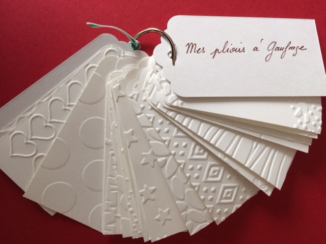 Nous avions toutes préparé un projet, et je tenais à vous présenter le mien 🙂 Il s’agit de regrouper grâce à un anneau un échantillon de tout ou presque les plioirs à gaufrage des catalogues en cours, soit le catalogue général et le catalogue Printemps Eté .
