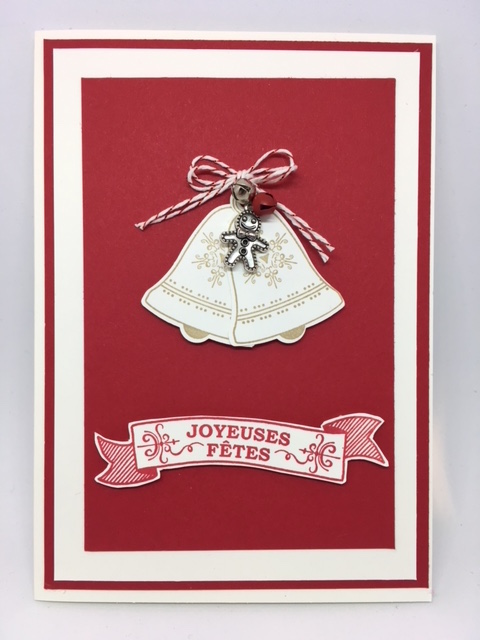 C’est aujourd’hui le jour de notre blog hop, et je vous présente mon projet sur le thème de noël. Une carte ou j’ai repris le set de tampon Cloches de circonstance réf 143127 ainsi que sa perforatrice que vous retrouverez dans la féerie en ligne réf 141846 .