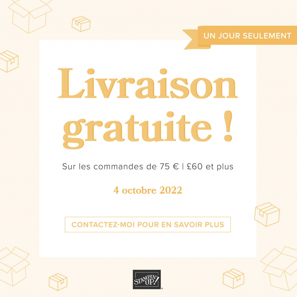 Juste un petit message pour vous annonce que Stampin’ Up ! offre les FRAIS DE PORT (7,95€) sur les commandes de 75€ ou plus pour UN JOURNEE SEULEMENT le mardi 4 octobre !